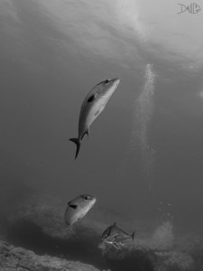 Selvagem Grande, sin embargo, es una isla acantilada, en la que la plataforma submarina que la rodea rápidamente cae hasta más allá de los 70 m. El buceo por lo tanto es de dos tipos. Se exploró la plataforma que contorna la isla, pero también, y aquí se realizaron las mejores inmersiones, se buceó en los bajos más alejados de la Isla, que ascendían en algunos casos desde más allá de los 60 m. En total más de 65 inmersiones. Los fondos son mucho más heterogéneos que en la isla pequeña y la topografía mas abrupta, conformada por pequeñas cuevas, gargantas, desplomes y formaciones volcánicas muy llamativas. En general encontramos más especies y en mayor cantidad. Fue frecuente ver grupos grandes de Kyphosus sp., Seriola spp. y algun grupo menor de Pseudocarax dentex, etc.