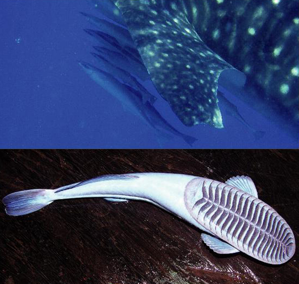 Echeneis naucrates junto al tiburón ballena (arriba). Remora osteochir obtenido en un marrajo (abajo). Imágenes sacadas de la publicación arriba citada..