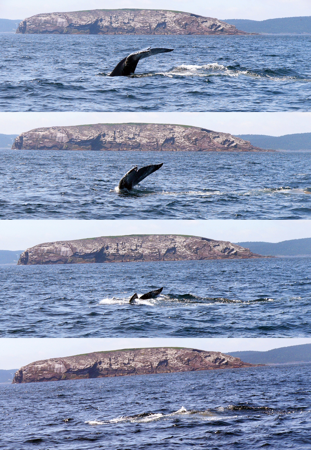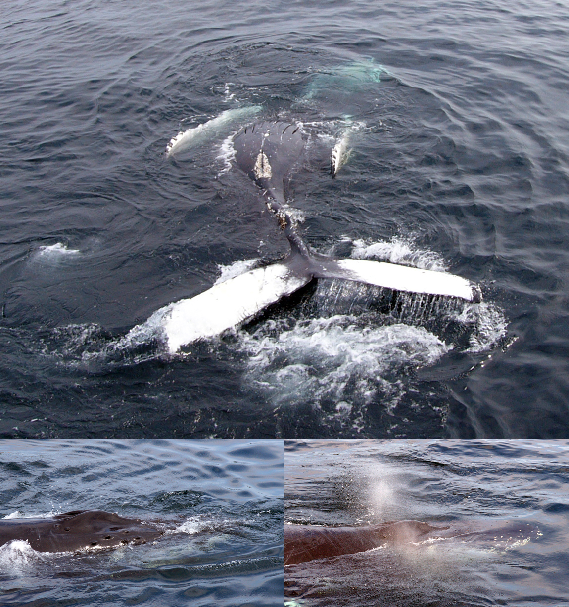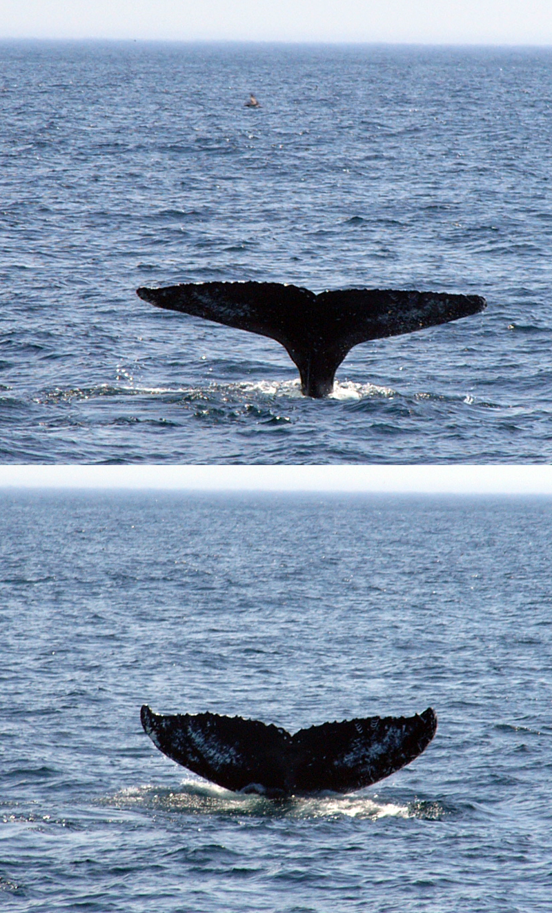 Estas especie de ballena es conocida por sus espectaculares saltos con los que consigue sacar casi todo su cuerpo fuera del agua. Por desgracia no fuimos testigos de tremenda exhibición atlética; pero sí que conseguimos alguna secuencia de cómo se sumergen.