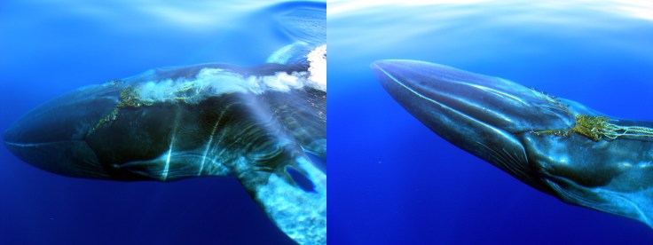 Nos encontramos en la isla de Pico haciendo de las nuestras, atareados entre buceos, censos visuales de peces y fotografía submarina, cuando salta la noticia: una rorcual común (Balaenoptera physalus) nada a pocas millas de costa enroscado en un cabo. Allás nos vamos a evaluar la situación y actuar si se hace necesario. Se trata de un rorcual de unos 10 m, que nada ligero a unos 3-4 nudos. El cabo enrosca toda la parte de la boca y los ojos, pero ante el buen estado aparente del animal, se decide no actuar por lo arriesgado de la operación.