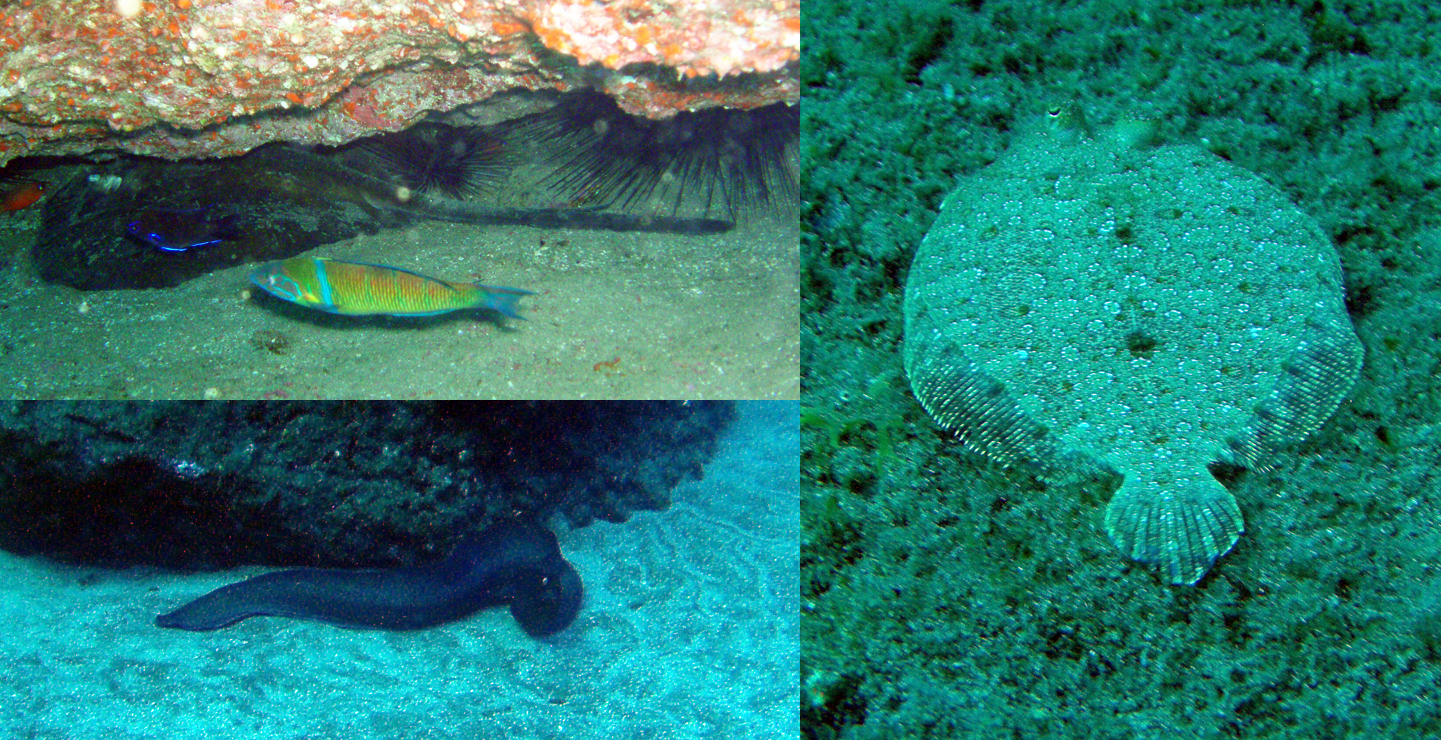 Las pastinacas se pueden observar escondidas en pequeñas cuevas. Lo que no es tan frecuente es ver son las morenas (Muraena augusti) fuera de su guarida rocosa. Los peces planos como el Bothus podas (en este caso se trata de una hembra, se ve claramente que tiene lo ojos juntos no como en el caso del macho) también se pueden ver si nos andamos con ojo.