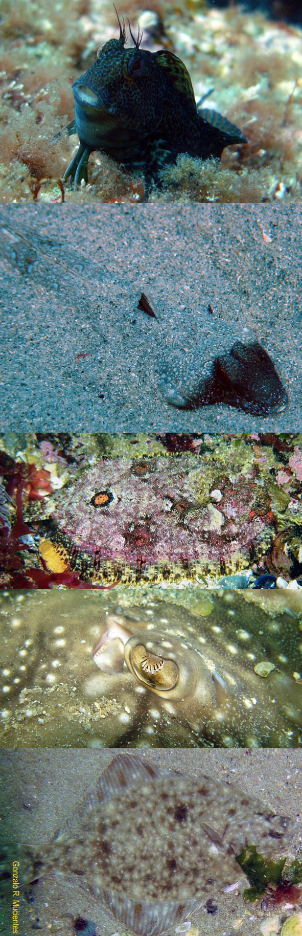 - Peces: Conger conger (congrio), Labrus bergylta (maragota, pinto), Pollachius pollachius (abadejo), Balistes capriscus (peixe porco), Raja undulata (raya), Ammodytes sp. (lanzón, bolo), Zeugopterus punctactus (tapaconas), Phrynorhombus regius (tapaconas), Callionymus lyra (escarpón), Diplodus vulgaris (sargo), Pleuronectes platessa (solla), Solea senaglensis(lenguado), Syngnathus acus (pez trompeta), Tripterygion delaisi (moma), Trisopterus luscus (faneca), Gobius niger, Gobius cruentatus, Coris julis (señorita, julia), Symphodus bailloni (vello), Serranus cabrilla (cabra), Atherina presbyter (piarda), Centrolabrus exoletus (piloto), Gobiusculus flavescens, Parablennius gattorugine.