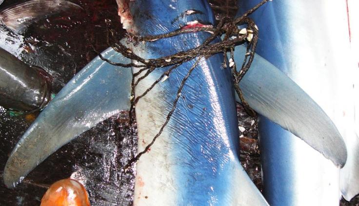 Cabo enrollado sobre tintorera (Prionace glauca) en el Pacífico sur. Foto: Gonzalo Mucientes