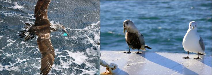 A la izquierda, juvenil de alcatraz (Morus bassanus) con red parcialmente ingerida. A la derecha, ejemplar de gaviota tridáctila (Rissa tridactila) manchada por un sentinazo en alta mar. Fotos: Gonzalo Mucientes
