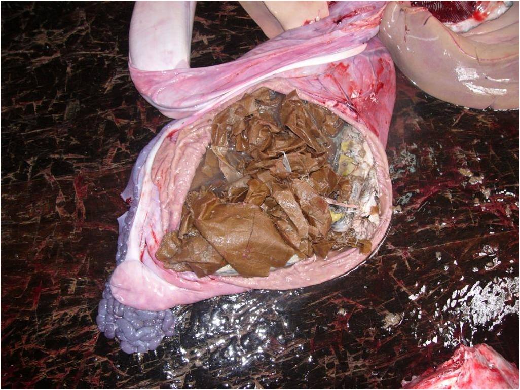 Caja de cartón en el interior de un estómago de marrajo azul (Isurus oxyrinchus), Pacífico sur. Foto: Gonzalo Mucientes