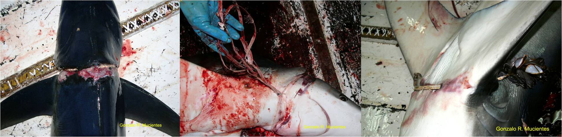 Plásticos hallados sobre ejemplares de tintoreras (Prionace glauca) en el Atlántico norte. Fotos: Gonzalo Mucientes