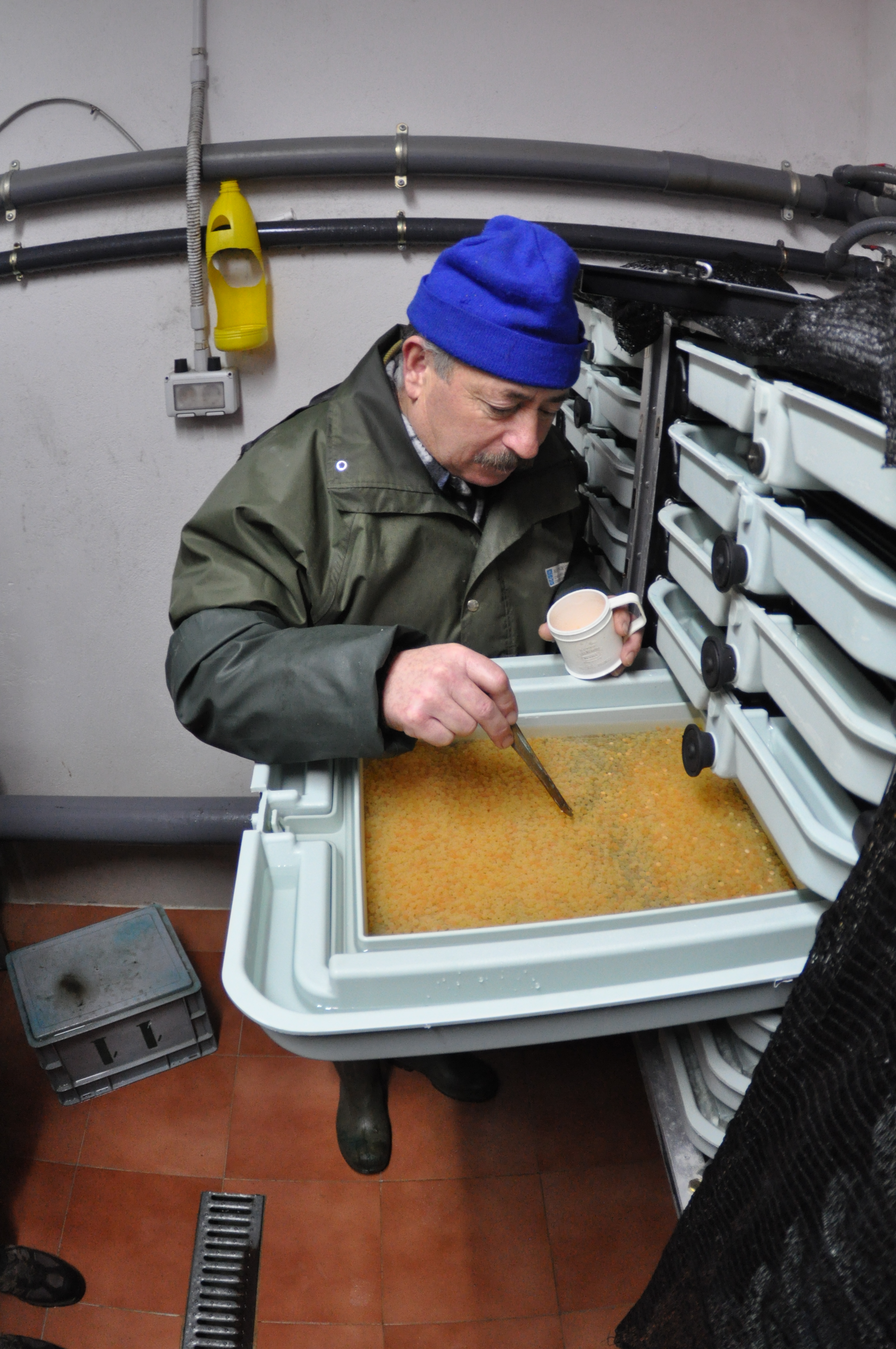 Después mediante presión abdominal se extrae el esperma de un macho. La fertilización se realiza mezclando a mano un poco de esperma del macho con los huevos, en unas pequeñas tinas. En ese momento los huevos son aún muy blandos, pero poco después se les añade agua y se endurecen al hidratarse. Posteriormente pasan a las bandejas de incubado con agua corriente en circuito cerrado. Al día siguiente se revisan las bandejas y se retiran a mano con unas pinzas (aunque puede automatizarse) todos los huevos muertos, reconocidos por su color más pálido. Hecho esto, los huevos se dejan desarrollar hasta la eclosión, semanas después.