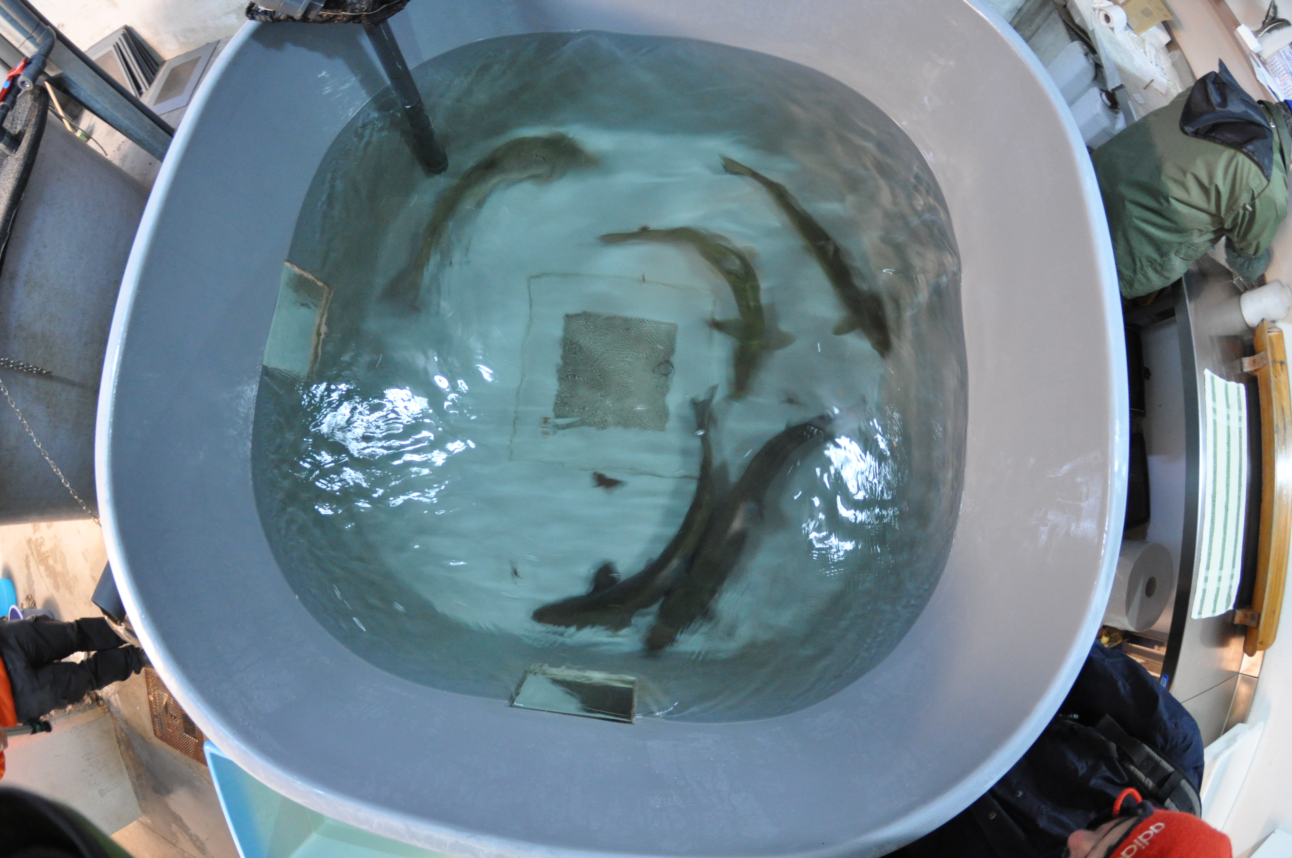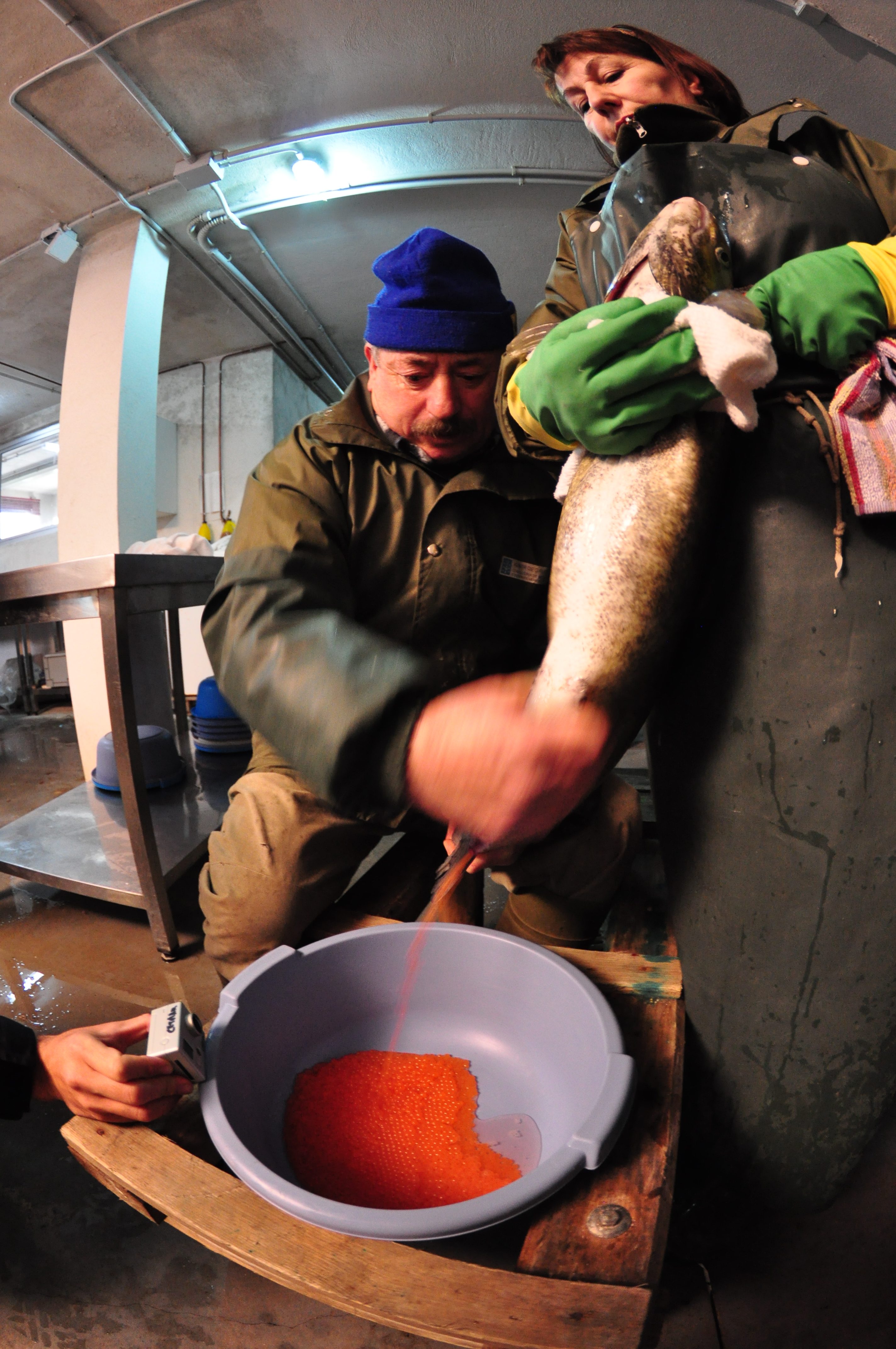 Una vez elegidas hembras y machos del día, se mantienen en un tanque aislados del resto. Posteriormente son trasladados a otro tanque más pequeño donde son anestesiados uno a uno y se desovan manualmente tal como se muestra en el vídeo. En algunos casos, el peso de los huevos liberados supone casi un 30% del peso de la hembra, lo que refleja la gran inversión reproductiva de estos animales.