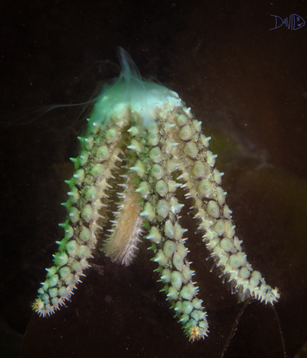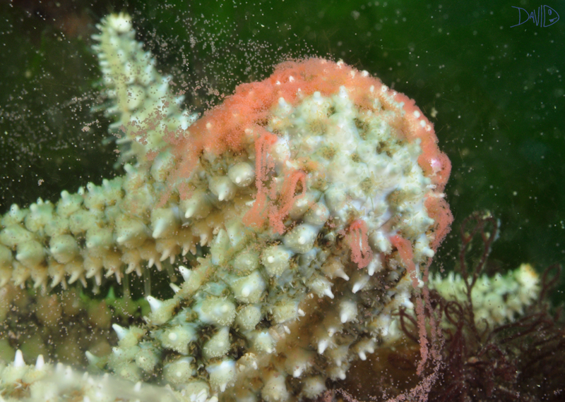 La semana pasada, durante una inmersión sin mucha historia en principio, fuimos testigos de un evento biológico tan interesante y bonito como difícil de observar: estrellas de mar en puesta. Las estrellas de la especie Marthasterias glacialis, una de las más frecuentes en Galicia, si no la más, sincronizan el momento en que liberan los ovocitos (las hembras) y el esperma (los machos).  El evento empieza con una migración de las estrellas a la partes más altas del arrecife. En este caso, estábamos a una profundidad de unos 6-8 metros, en el típico fondo de piedra cubierto de algas Laminariales. Las estrellas en muchos casos estaban posadas sobre las frondes de estas algas, y en otras en los puntos altos de las rocas. Su objetivo parecía ser el no terner ningún obstáculo entre ellas y la columna de agua, nada que impidiese la mezcla de productos sexuales y su dispersión.  En resumen, el arrecife estaba literalmente recubierto por estrellas de mar, muchas más de las que se pueden observar en cualquier otra inmersión, debido a que todas las estrellas de las capas inferiores del arrecife habían «tomado posición».