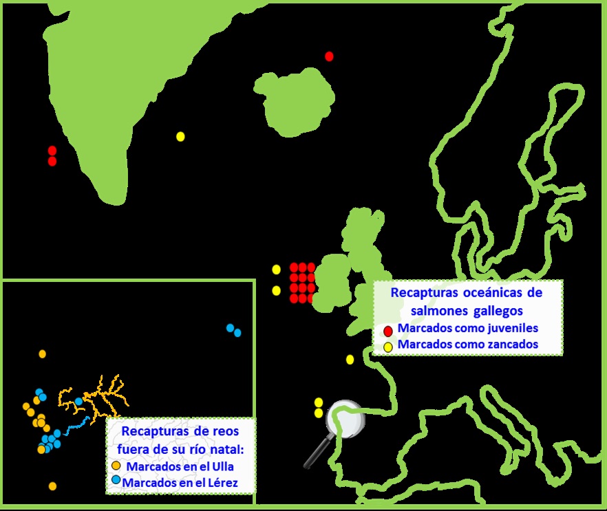 El equipo de la Xunta de Galicia ha obtenido 21 recapturas en el mar, 15 de ellas de peces marcados como juveniles en la piscifactoría de Carballedo y soltados en ríos de Pontevedra (Ulla, Lérez y Miño), y de 6 de ellos se obtuvo información de sus marcas PSAT, tras serles insertadas como zancados. Estas “recapturas” de post-zancados fueron registradas por satélites entre uno y tres meses tras su suelta, en lugares que se interpretan como de paso hacia sus áreas de alimentación definitivas. En concreto estos salmones fueron registrados frente a la costa de A Coruña, Bretaña, costa oeste de Irlanda y uno entre Islandia y Groenlandia. Las recapturas de los salmones en el mar se muestran en la siguiente figura (Caballero, 2013):