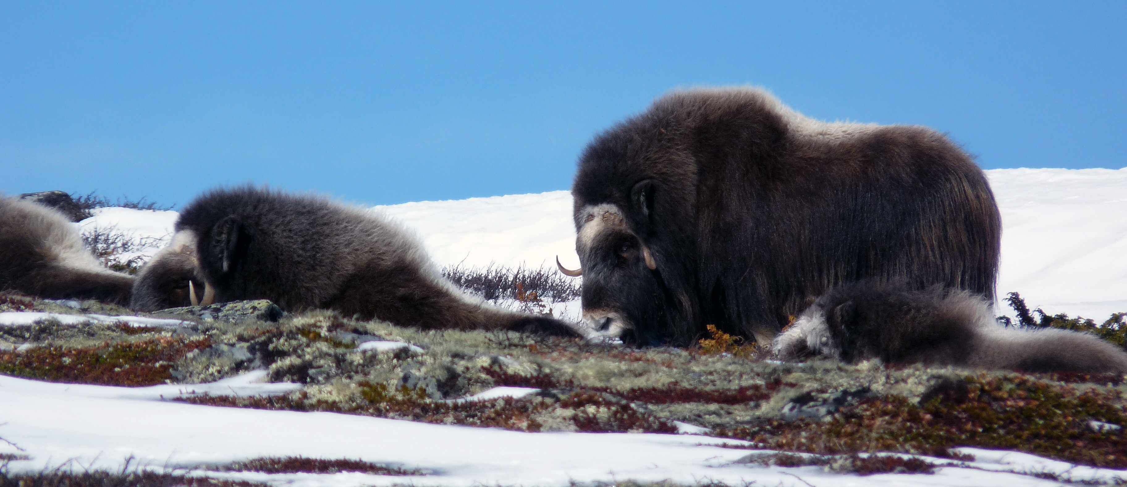 Más al norte, la visita al Parque Nacional de Rondane fue breve, en gran medida por la inaccesibilidad de sus caminos. Logramos hacer un loop con raquetas en el que no logramos observar prácticamente nada, seguramente debido a la climatología. Dovrefjell–Sunndalsfjella National Park se encuentra un poco más al norte, siguiendo la carretera que llega a la ciudad de Trondheim. Es conocido por albergar una población estable de buey almizclero (Ovibos moschatus) de unos 300 ejemplares, reintroducido en los años 1932 y 1953 tras su extinción en Europa hace 9000 años. Se trata de un bóvido ártico emparentado con las cabras, cuyos machos son capaces de emitir un fuerte olor dirigido a atraer a las hembras durante la época reproductiva.