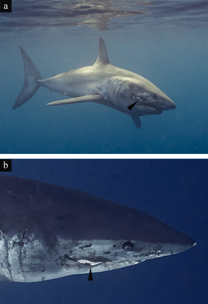 La llamativa herida longitudinal podría haber sido causada por una interacción con un pez vela o marlín (Istiophoridae) o un pez espada (Xiphias gladius), ya que se han reportado varios casos (Penadés-Suay et al. 2019; Romeo et al. 2020). No obstante, considerando la forma, ubicación y aparente poca profundidad de la herida, parece más probable que haya sido producida por un anzuelo y el proceso de desenganche antes de liberar al tiburón, posiblemente por un buque palangrero comercial o un pescador recreativo.
