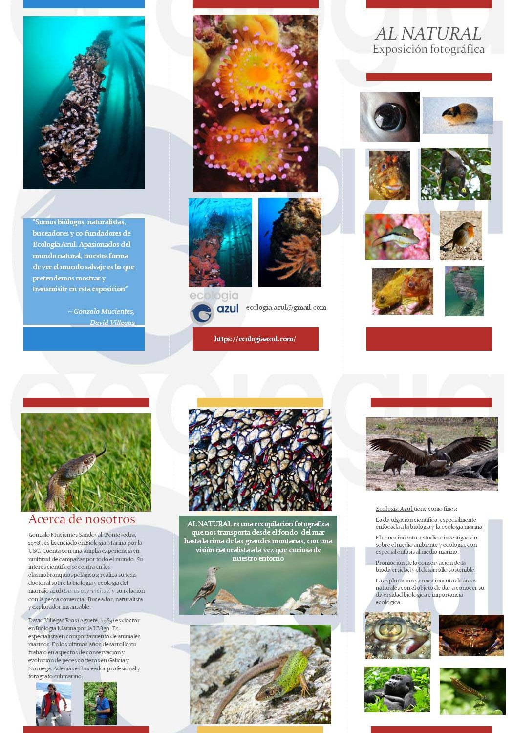 Ecoloxía Azul presenta la exposición fotográfica de naturaleza «Al Natural«. Realizada por los biólogos David Villegas y Gonzalo Mucientes pretende transmitir una visión personal y apasionada sobre la biodiversidad de nuestro planeta, tanto terrestre como marina. Las instantáneas seleccionadas han sido obtenidas durante años de viajes y expediciones por océanos, selvas, desiertos, montañas y áreas boreales de todo el globo, sin dejar de lado la Galicia salvaje. Siempre al natural.